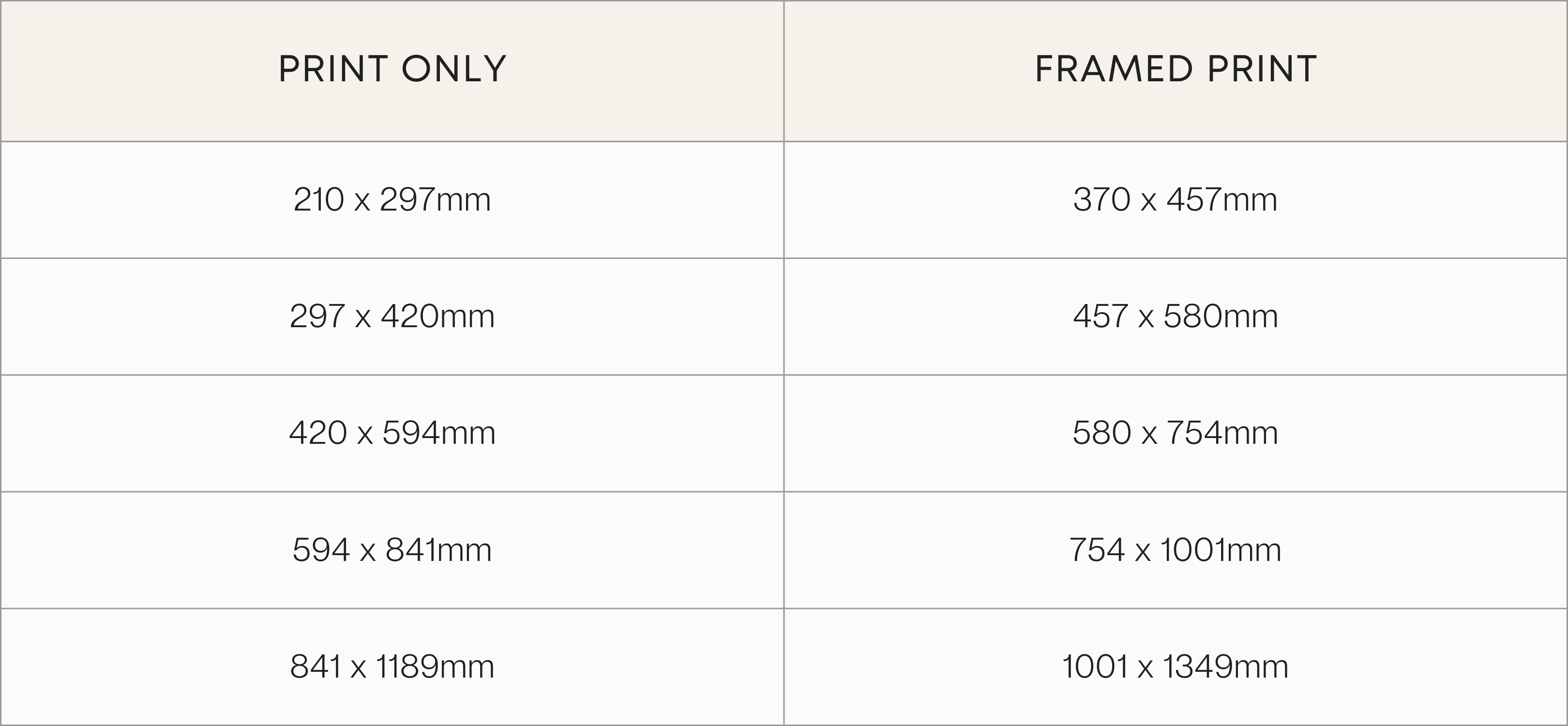 Our custom framing is available in three timeless finishes: Black, White, or Raw Oak—crafted from sustainably sourced Tasmanian Oak. Each frame includes a 4cm mat between the print and frame, adding a refined and elegant finish. Use the table below to determine the final dimensions of your print once framed.